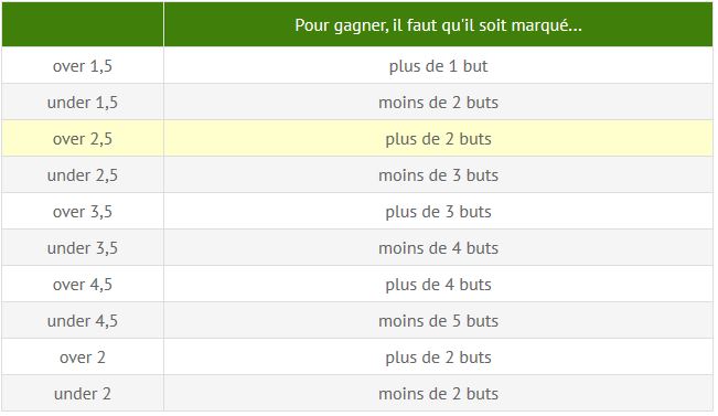 Over (au-dessus ou plus ) et Under (en-dessous ou moins), il s'agit ici de parier sur le nombre de buts marqués lors d'une rencontre. Voici ci-dessous la liste des paris possibles ainsi que leurs significations :