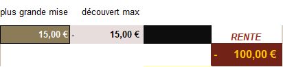 La plus grande mise en cours, le découvert maximum, la rente. C'est dans le cadre noir que s'affiche "CRITIQUE" et c'est donc le moment d'arrêter et de recommencer ou d'augmenter votre capital.