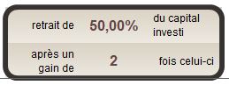 Tout au long de la gestion GEM, vous pouvez faire des retraits d'argent, en fonction du pourcentage du capital investi, après un gain de X fois ce capital. Vous pouvez changer ces 2 paramètres comme vous voulez.