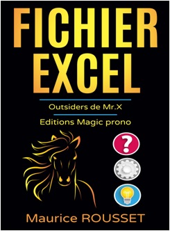Si vous voulez augmenter encore plus vos chances, si aucun des numéros n'a été à l'arrivée dans les 3 premiers lors des 2 quintés précédents, les chances augmentent encore plus pour que le coup suivant, il y en ait au moins un à l'arrivée. Vous pouvez donc jouer uniquement dans ces moments là si vous le désirez. Cela dégagera encore plus de bénéfices. Mais nul doute que vous découvrirez d'autres choses, tellement le tableau des arrivées des quintés est clair. Des indications supplémentaires sont données dans le livre Les outsiders de Mr.X pour avoir encore plus de chances de gagner tout en misant moins. Je vous garantis que La méthode Les outsiders de Mr.X va beaucoup vous plaire. Il n'y en a aucune autre comme celle là et qui détecte autant de belles cotes à l'arrivée. C'est vraiment la seule façon d'en toucher beaucoup. Et pour que ce soit encore plus simple, avec l'achat du fichier Excel Outsiders de Mr.X, je vous offre les tableaux mis à jour avec les arrivées de quinté de trot, plat ou obstacles depuis 4 ans. Des témoignages très significatifs - Ce fichier Excel, c'est vraiment ce que j'attendais. Quelle facilité d'emploi ! On voit vraiment tout d'un seul coup d'oeil. Passionnant. Bravo Monsieur ROUSSET et merci beaucoup. G.T. Orléans. - Il faut toujours que vous en fassiez plus pour le bonheur de vos clients. J'ai le logiciel Les outsiders de Mr.X mais avec le fichier Excel, c'est encore mieux. Vous nous avez vraiment concocté un beau fichier. Et avec les conseils de la notice, je vais en faire beaucoup plus. Merci pour tout ce que vous faites. T.D. Bruxelles. BELGIQUE. - Vraiment super ce fichier Excel. Difficile de faire mieux avec autant de facilité d'emploi. Je sens que je vais me régaler. Félicitations. J.P.L. Bergerac. - Je me rends compte que ce fichier comporte des choses bien intéressantes. On va sans doute encore en parler longtemps. G.L. Thionville. - Merci beaucoup d'avoir offert aussi le fichier avec les quintés de plat et d'obstacles. On y voit vraiment des choses incroyables comme par exemple le nombre de gagnants à grosses cotes. C'est très impressionnant ! Merci pour de travail formidable que vous faites pour le plus grand plaisir de vos clients. G.S. La Garde. - Merci pour ce tableau Excel. C'est vraiment très facile à utiliser et nous avons les chevaux sélectionnés en moins de 3 secondes. Quand je faisais les tableaux à la main, je faisais régulièrement des erreurs de saisies parce que je ne faisais pas attention. Tout ceci est du passé maintenant et il n'y a plus aucune erreur possible. Vous avez réalisé un tableau formidable. M.S. Brest. - En plus de la méthode elle-même, je découvre de plus en plus de choses extrêmement intéressantes dans ce tableau d'une rare clarté. Je pense que c'est la plus belle chose que vous ayez faite. Bravo ! R.J. Roanne. - Ce fichier est tout simplement fantastique. Je prépare mes jeux uniquement avec lui. C'est si simple à utiliser et le tableau tellement clair que je ne fais plus aucun tableau à la main. J'ai même mis le logiciel que je possède de côté. Y.F. Lausanne. Suisse. - Je suis très heureux de la disponibilité de ce fichier. En plus de la clarté et de l'utilisation tellement facile, on peut faire avec le tableau vierge, ses propres tableaux sur les courses que l'on veut. Par exemple, j'ai choisi d'en faire un sur la plus grosse allocation de la journée. Quel bonheur ! V.D. Dieppe.
