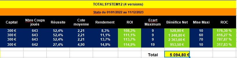 Sur 643 matchs sélectionnés du 1er janvier 2022 au 11 décembre 2023, nous obtenons au total 5094 € de bénéfice net en jouant :